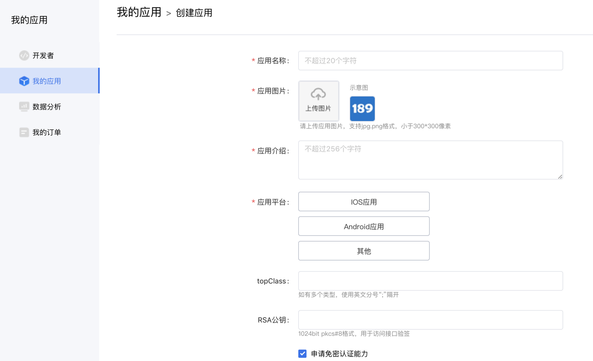 待开发者资质认证成功后,进入“我的应用——创建应用”,填写应用名称、应用介绍、RSA公钥并上传应用图片,选择应用平台并填写Android包名/IOS Bundle ID、Android应用签名。